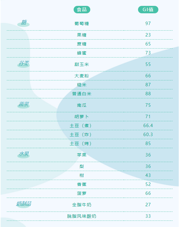 是不是發(fā)現(xiàn)了,含糖量較高的糖類及普通主食GI值一般都比較高,食物的烹飪方式也對GI值有一定影響。