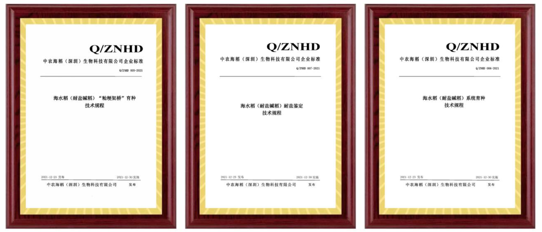 2021年12月23日,由中農(nóng)海稻(深圳)生物科技有限公司起草的海水稻(耐鹽堿稻)“秈粳架橋”育種技術(shù)規(guī)程(Q/ZNHD 005-2021)、海水稻(耐鹽堿稻)育種技術(shù)規(guī)程(Q/ZNHD 006-2021)、海水稻(耐鹽堿稻)耐鹽鑒定技術(shù)規(guī)程(Q/ZNHD 007-2021)三個企業(yè)標(biāo)準(zhǔn)正式發(fā)布。