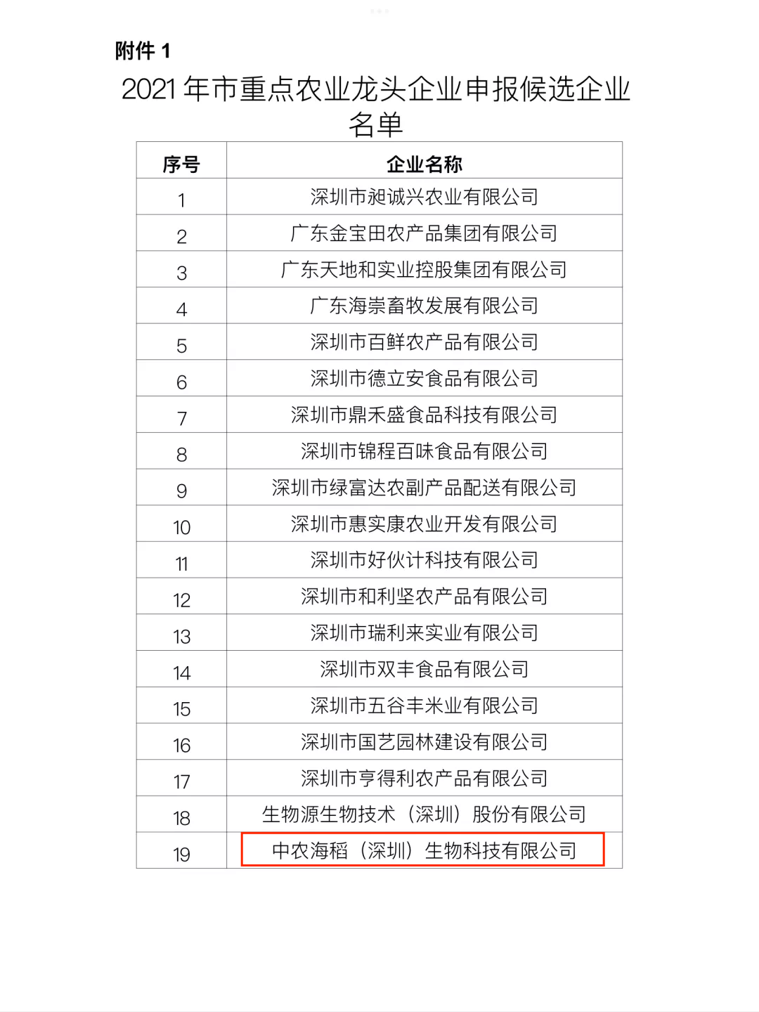 2022年1月30日,深圳市市場監督管理局公示了2021年市重點農業龍頭企業評審結果,中農海稻公司成功入選。