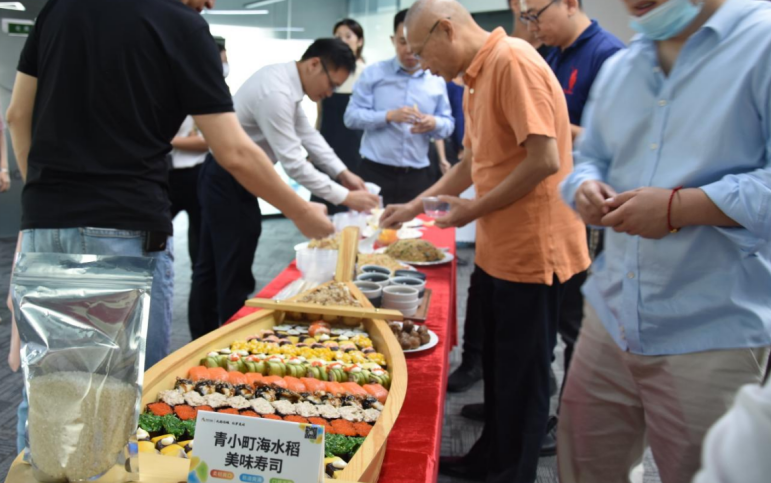 中農(nóng)海稻公司副總裁李莉帶領(lǐng)參會代表參觀中農(nóng)海稻公司,生動地講解了中農(nóng)海稻公司的發(fā)展史,并帶大家現(xiàn)場品嘗了青小町海水稻壽司、抗性淀粉米特色炒飯等中農(nóng)海稻公司健康功能大米做成的特色美食。